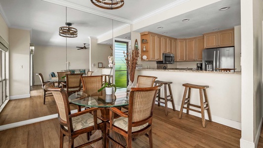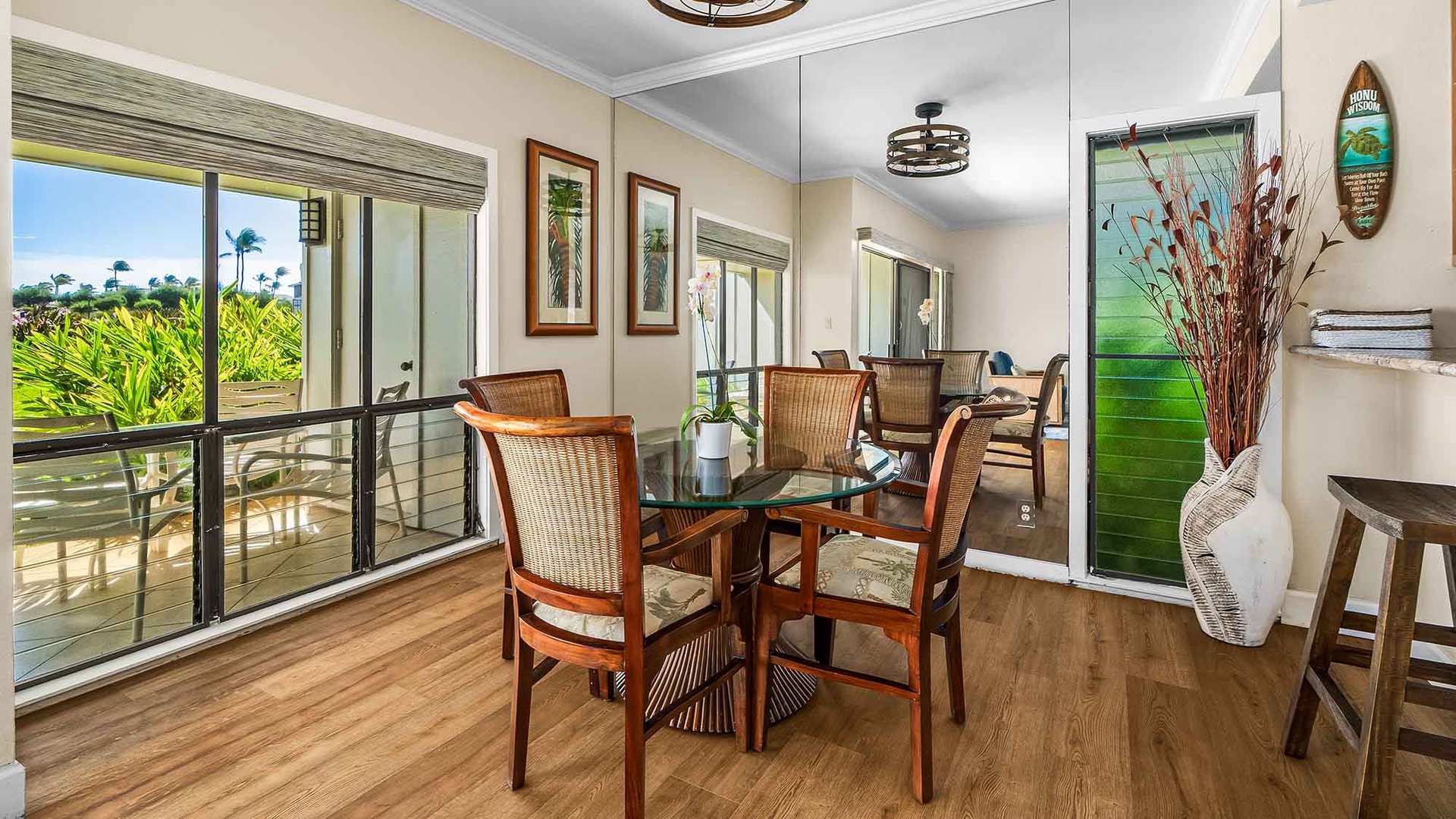 The condo kitchen was great, we cooked all of our meals there, a cooler, umbrella and beach chairs were provided, which made it easy to take lunch to the beach. The beds were comfy, the living room, dining room and kitchen were connected and made for nice gathering. There is a view of the ocean from the lanai and each morning we walked down to the beach to watch the sun rise. The one negative was the outdated lockbox key set up with a door handle that doesn't automatically unlock and has to be manually unlocked, which creates a dangerously easy situation for accidentally getting locked out within the first minutes of arrival. Highly suggest a keypad entry for the door or a secondary lockbox.
