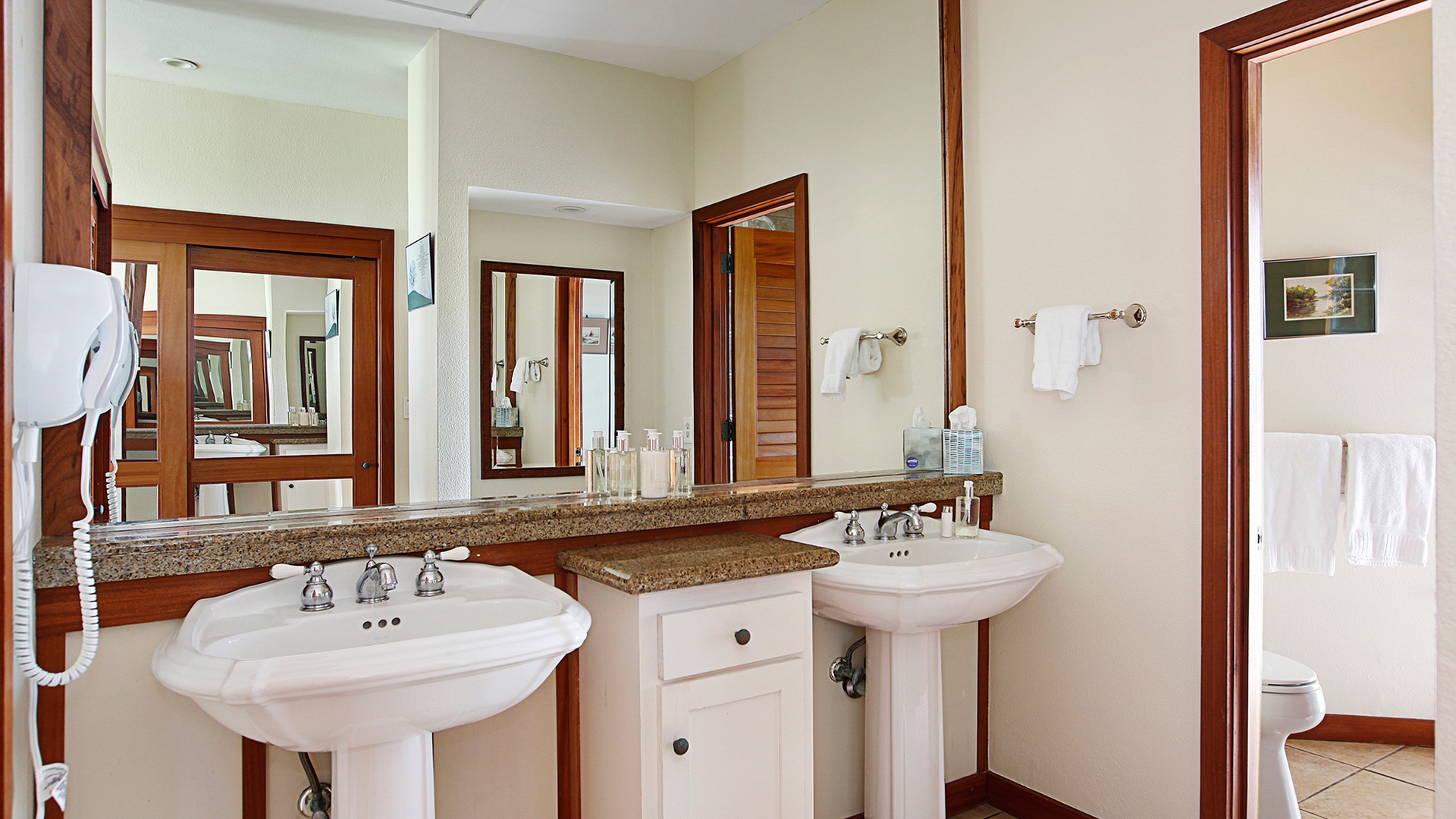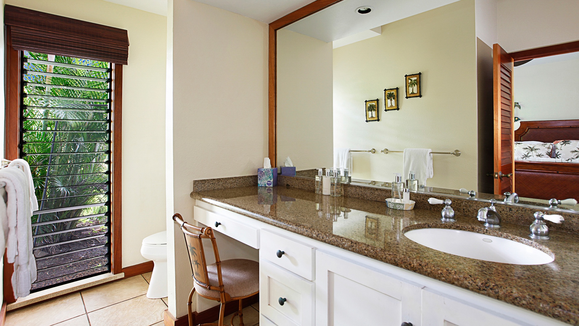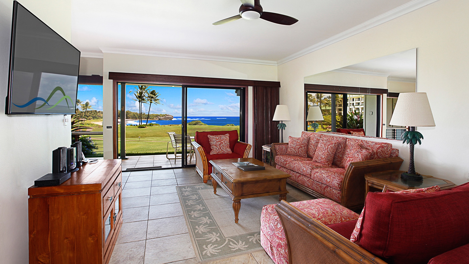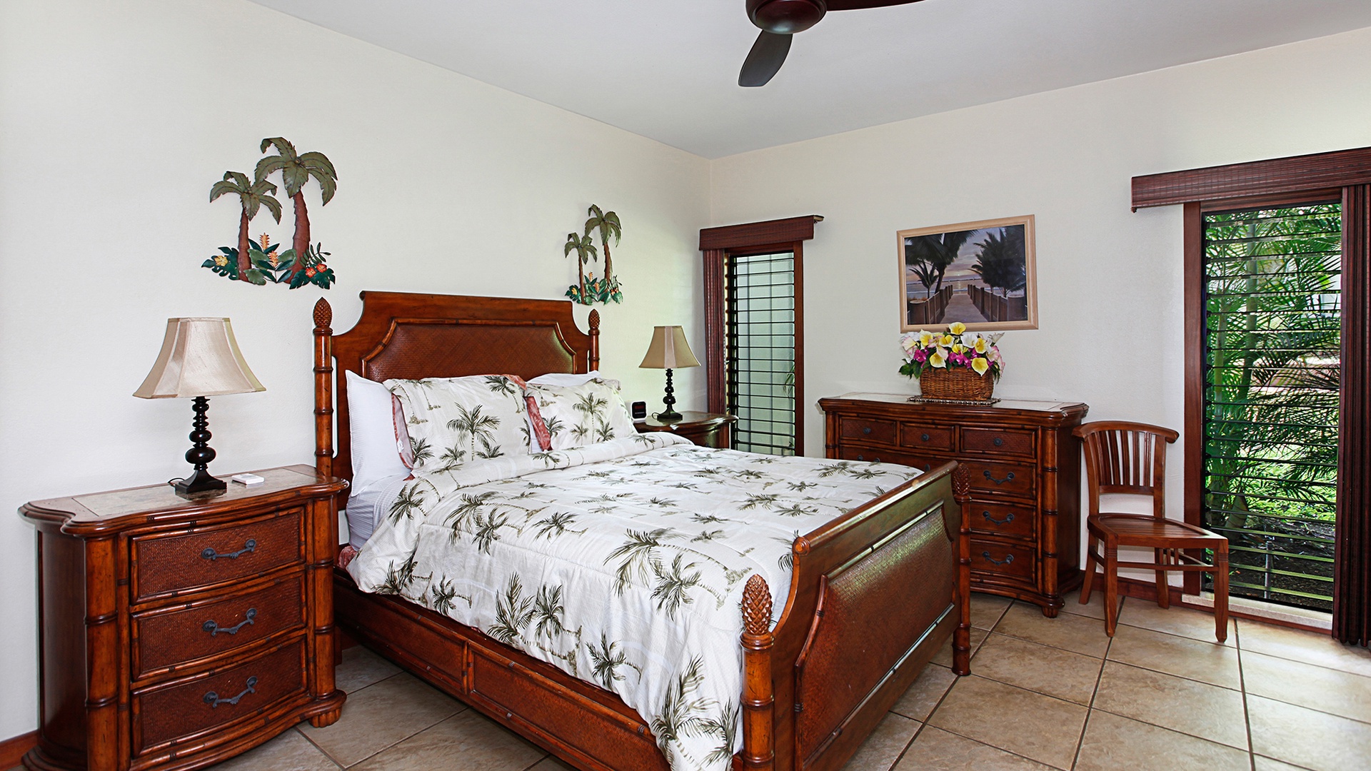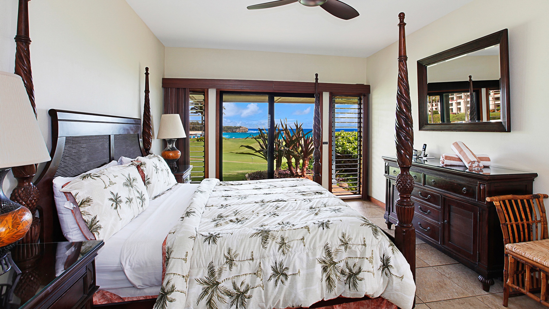 • Master Suite – Ocean view, king bed, TV, full bath with walk-in shower, private lanai