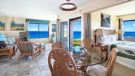 Location location location is what makes this property so special. The view over the ocean for sunrise, whale, dolphin and bird watching is the best. The apartment, although a bit dated and showing some wear, is laid out nicely for comfortable seating and relaxation. We especially loved the corner day bed! Full moon rise view. There was repair/replacement work being done on the sidewalks and entrance to our apartment so we had to walk on dirt/rock with our luggage. We would definitely return to this property for our next visit to Kauai.