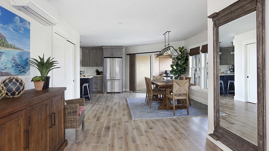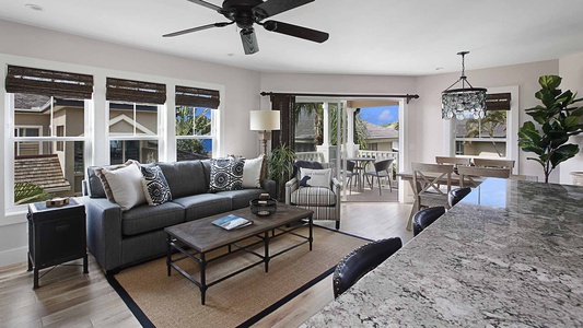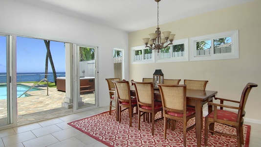 The main residence features a two-story oceanfront layout with expansive living and dining areas, a fully equipped kitchen, and sweeping ocean views from nearly every room. Each bedroom includes air conditioning, and the master suite opens to a private lanai overlooking the sea. The two adjacent townhomes, appointed with fully AC, add an additional five bedrooms between them—each with private baths, ocean-view lanais, and modern furnishings. Just steps from Brennecke’s and Poipu Beach Park, the estate is perfectly situated for snorkeling, swimming, and sunset strolls. Whether hosting a family reunion, a group retreat, or a celebration with friends, Villa Kailani Estate offers the perfect blend of privacy, luxury, and togetherness on Kauai’s sunny South Shore.