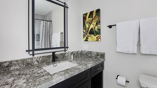 • Second Bedroom Suite – Queen bed, upper level, TV, AC, shared ocean view lanai, private bath with shower tub combination.