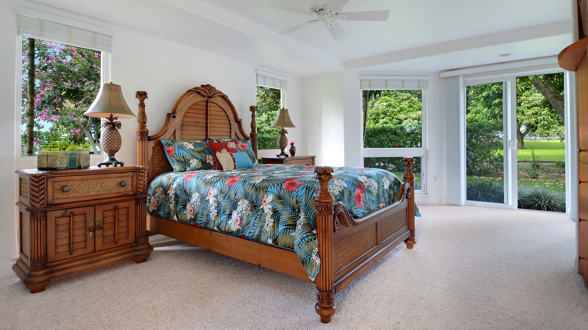 This spacious Kauai condo at Princeville Resort offers beautiful golf course views, two master suites on the lower level and a third bedroom upstairs. Located on the lush North Shore Kauai and next to the Makai Golf Course, it is only a short drive to Hanalei Bay and many Kauai beaches. Stop by our office at the Princeville Shopping Center and meet our guest concierge who can offer recommendations for shopping, activities and dining.