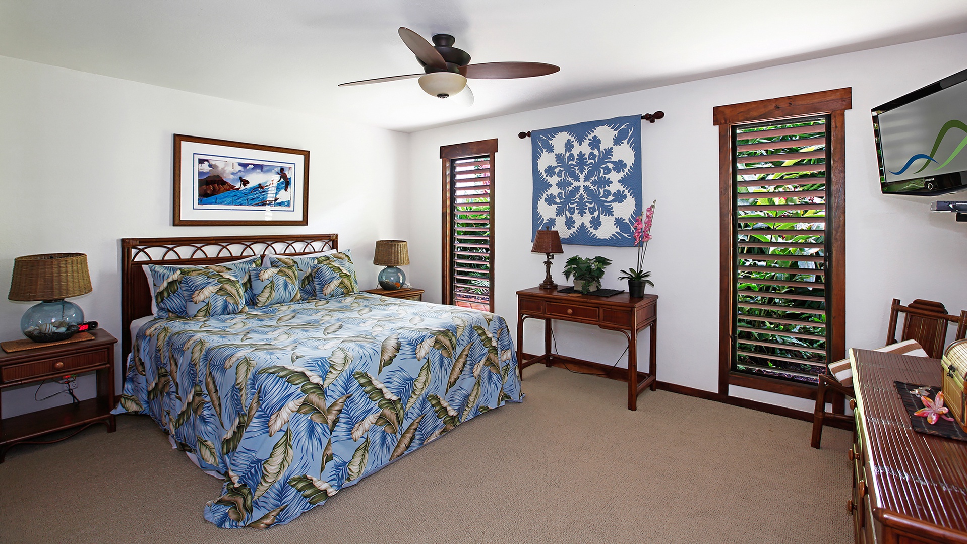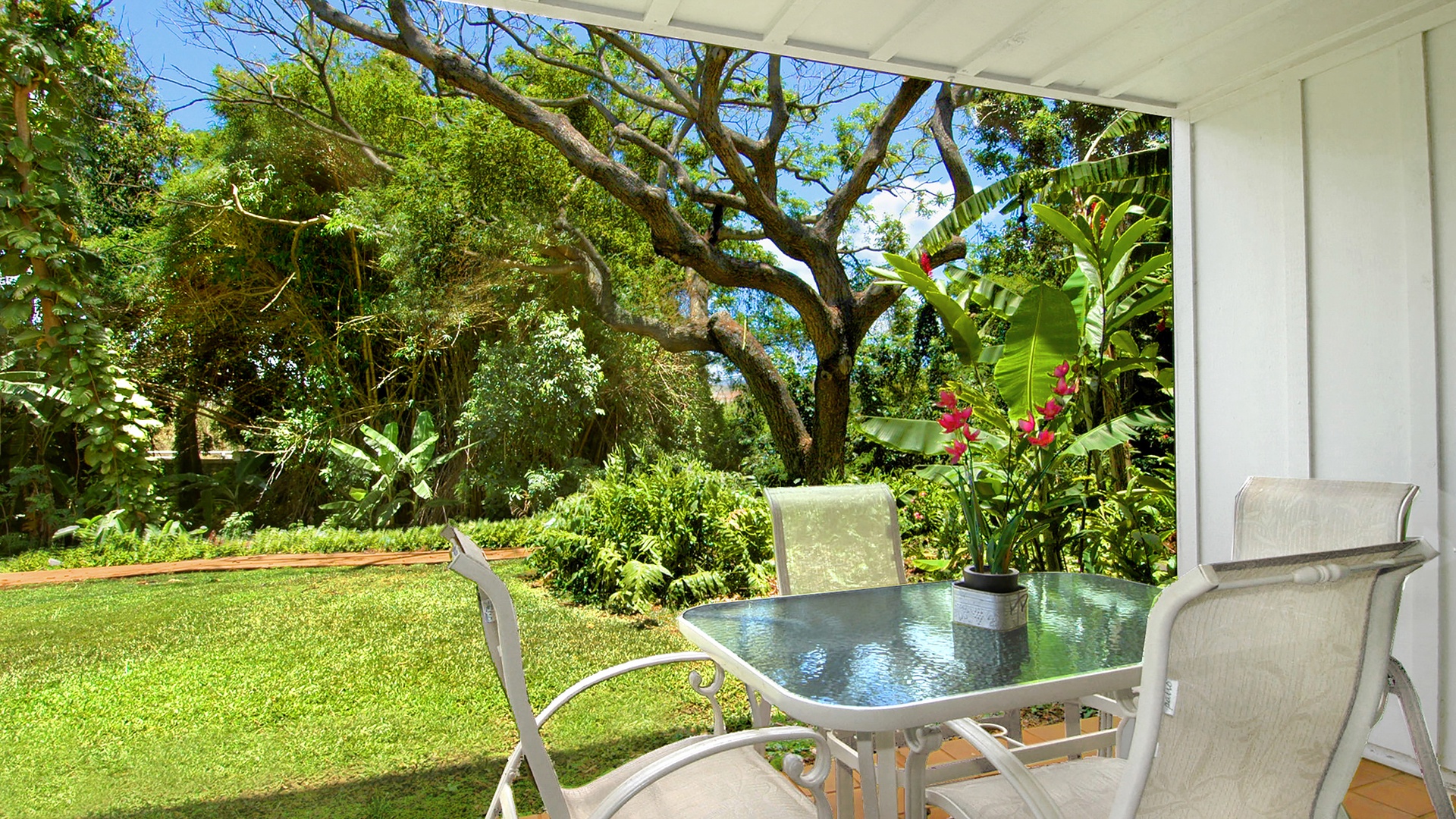 This is a wonderful ground floor unit. The lanai is such a peaceful place to look at the plants and massive trees. The kitchen appliances are perfectly organized, and we had everything we needed to prepare our meals. Though the unit is near Poipu Road, the traffic was barely audible, and certainly not visible. Everything is set up for a comfortable and peaceful time. It’s a short walk to the pool, and such easy access to roads to beaches, Koloa, and the gardens and hikes in Waimea Canyon.