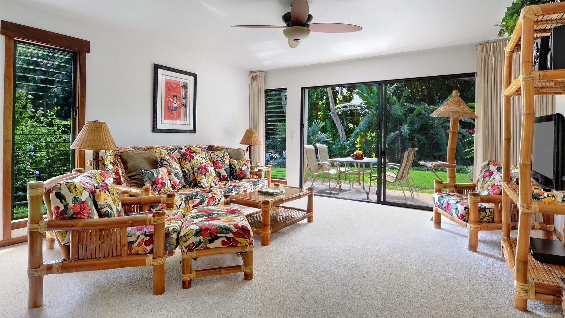 • TV/DVD/VCR/CD and sleeper sofa in living room, private lanai