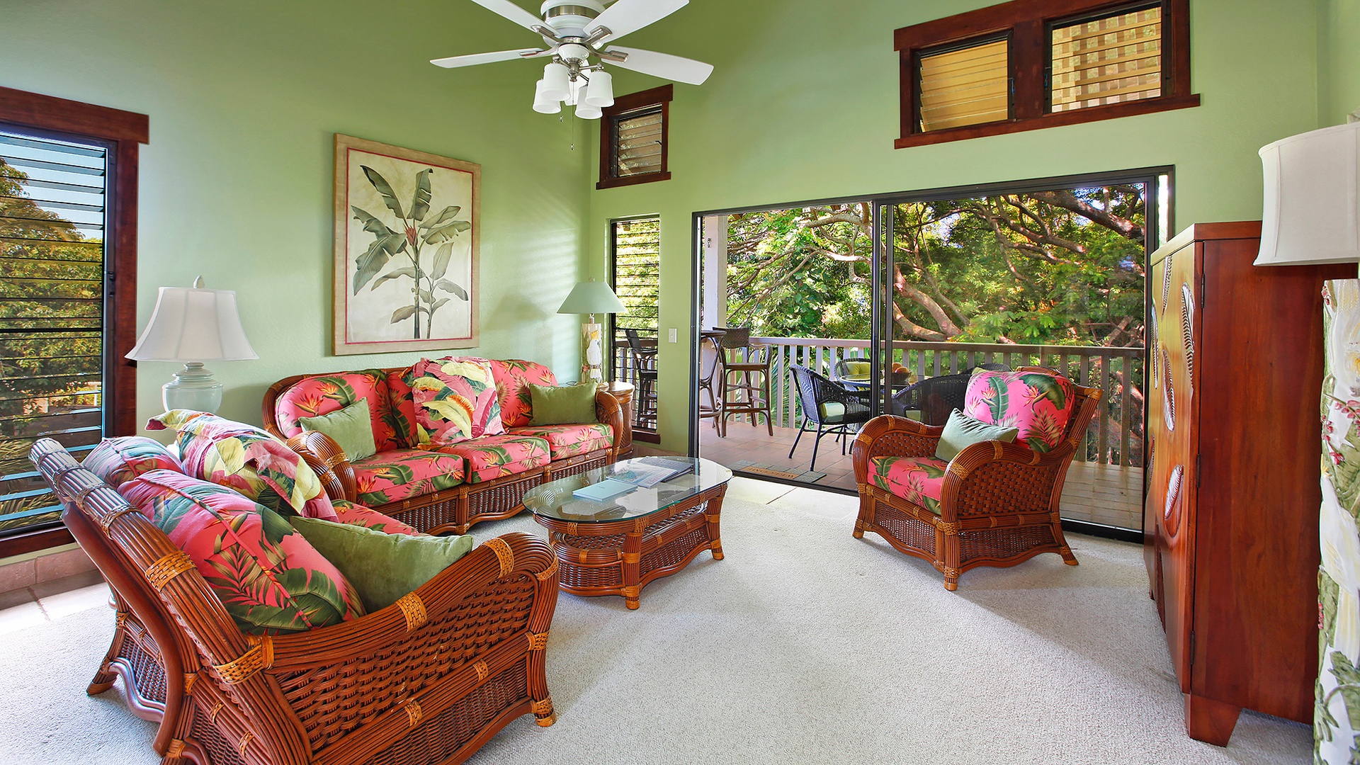 We loved staying here! We\'re already looking forward to booking it again on the next trip back to Kauai. It was a wonderful location close to snorkeling, shops, beaches, and restaurants. The gardens in the condo villa are wonderful, and there is a nice peacefulness about the place (aside from the crowing roosters, which are everywhere in Kauai!). The interior furniture and artwork are nice and have great island vibes. The place was clean and well equipped for cooking meals (there is a grill for use near the condo pool). The lanai was a nice place to gather after a long day of fun activities.