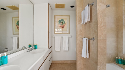 • Master Suite – second level, king bed, TV, ocean view, full bath with tub and shower combination
